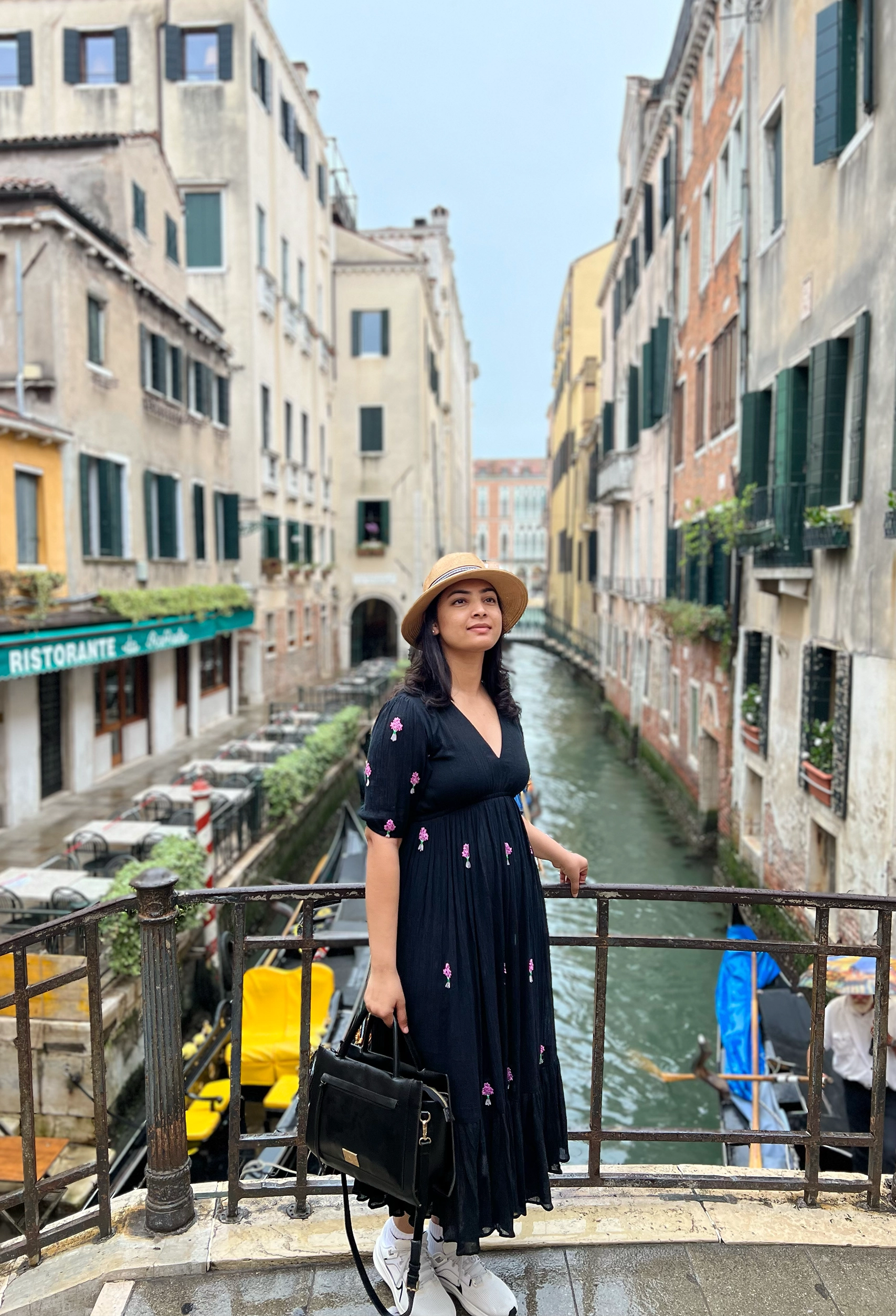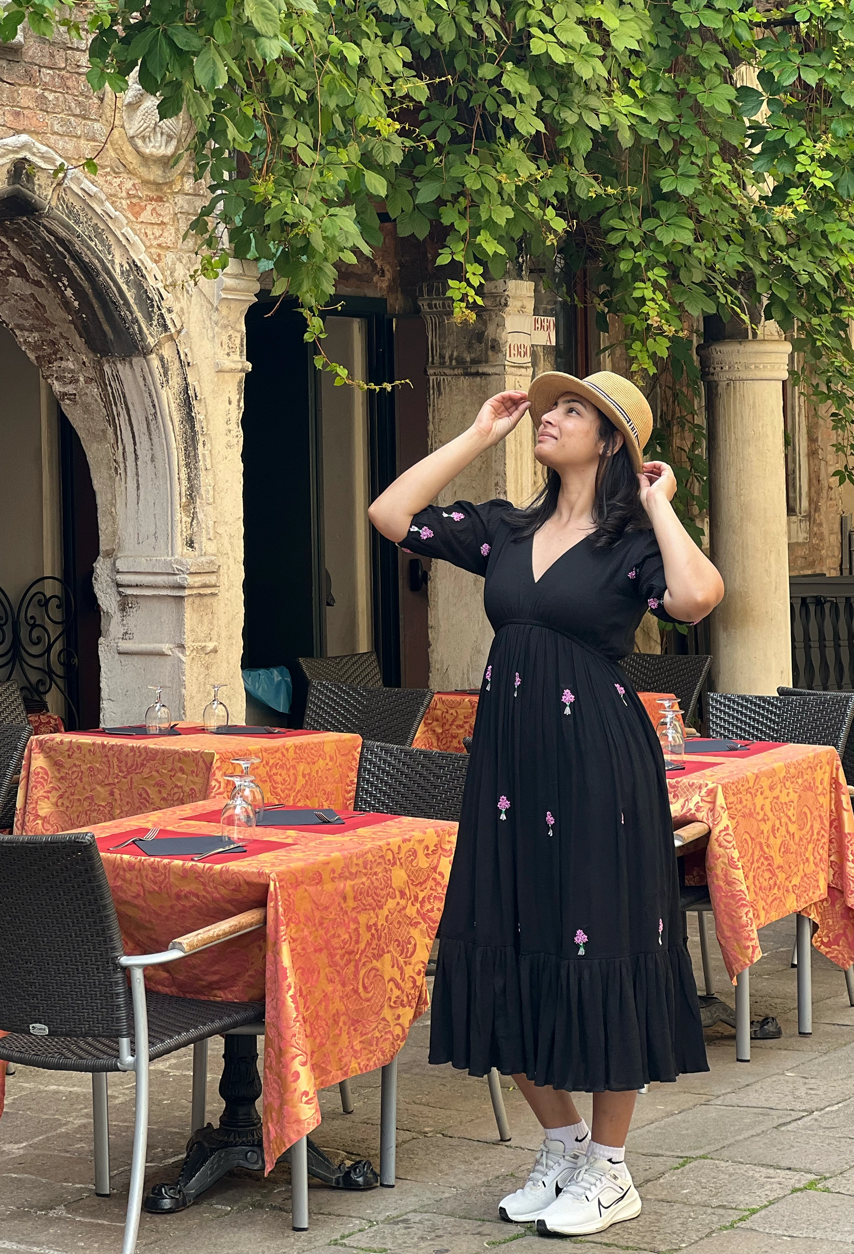 Bright hand-embroidered floral motifs bloom across the sleeves and body, adding vibrant pops of color to the dark canvas. Designed with puff sleeves, a tiered hemline, and soft cotton lining, Nivara transitions seamlessly from casual evenings to elegant get-togethers.