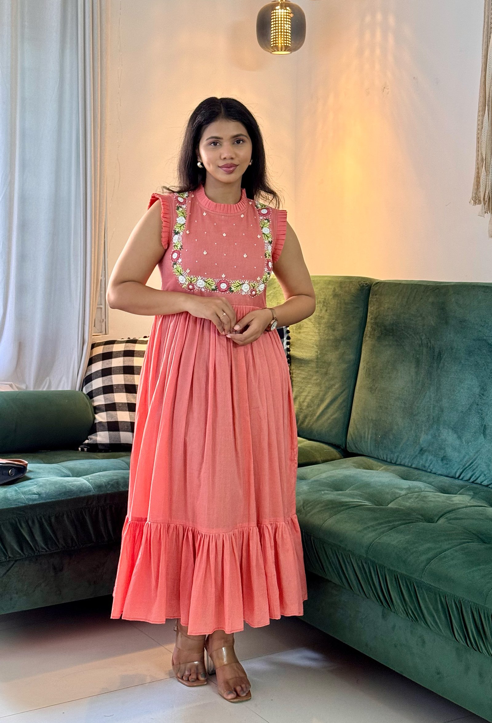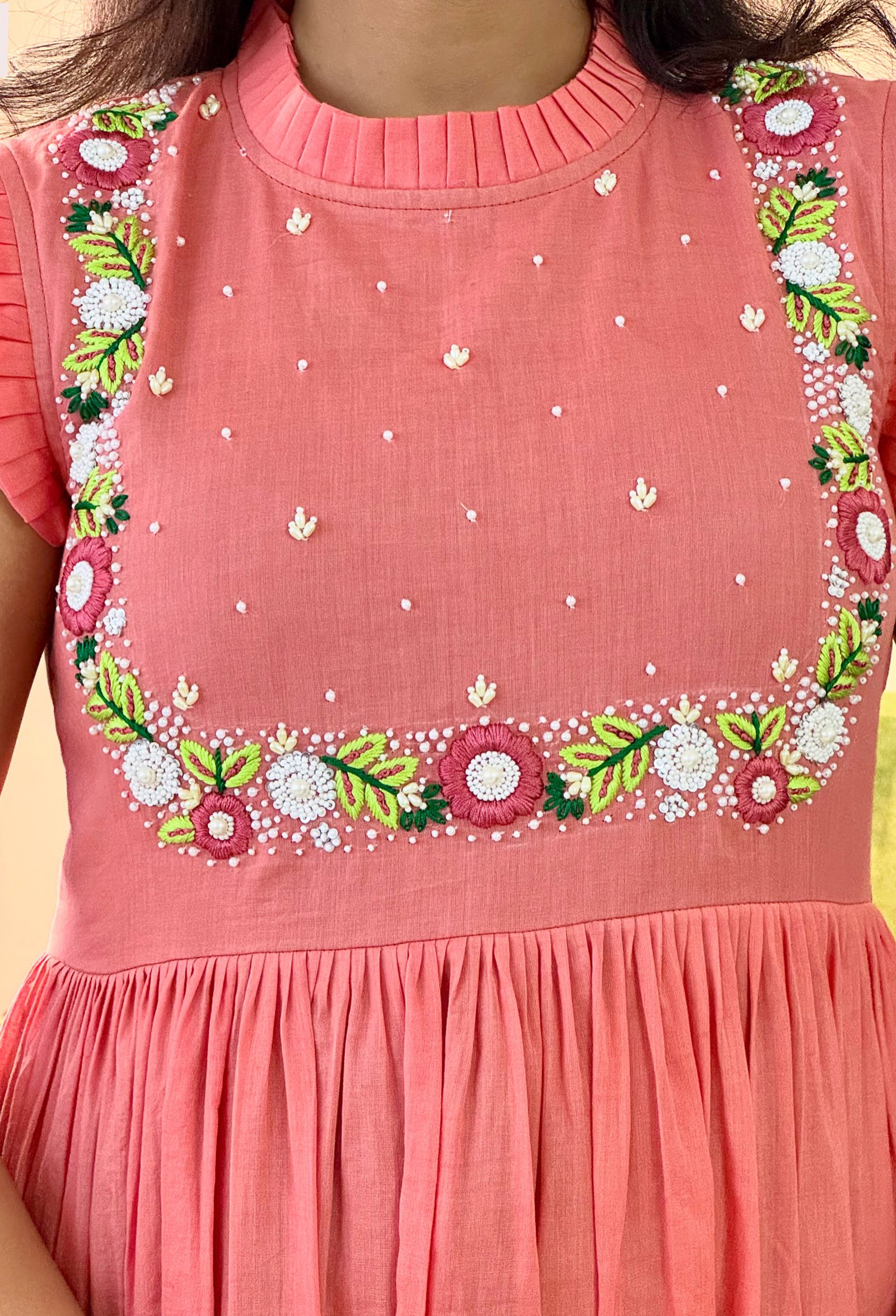 This handcrafted mul cotton dress in a delicate peach-pink hue is designed for soft charm and serene presence. The silhouette features a gathered empire waist that flows into a relaxed A-line, offering graceful movement and comfort. Ruffle sleeves add a youthful detail to the high neckline, while the embroidered yoke is carefully hand-finished with pearl accents, thread florals, and dotted motifs for a hint of sparkle.