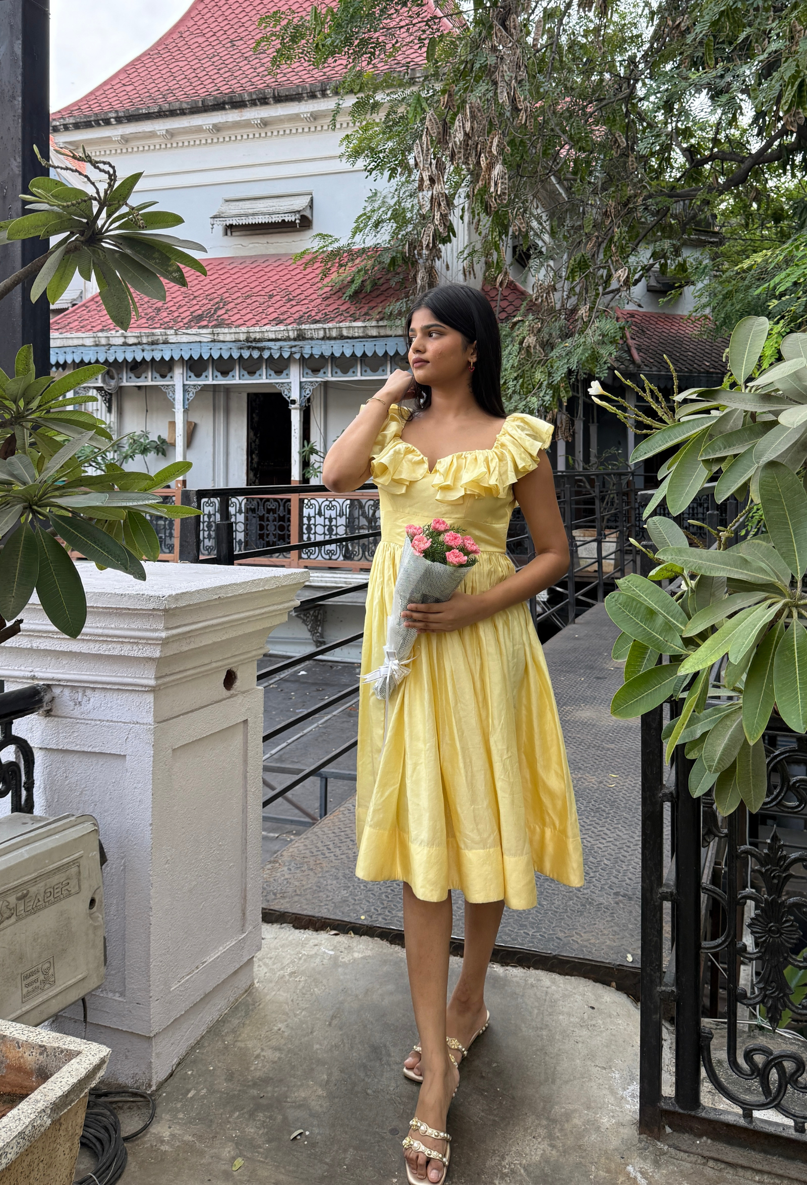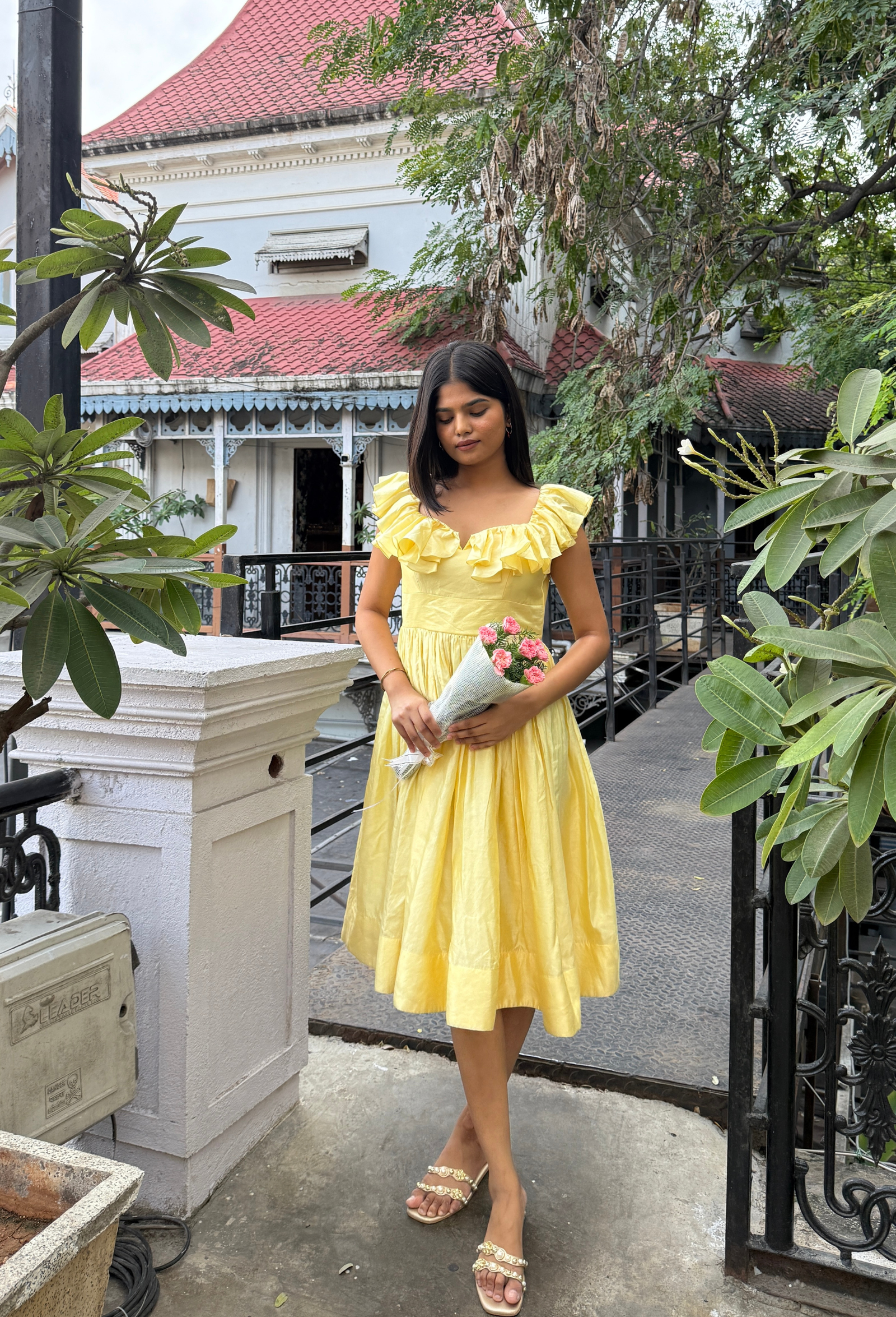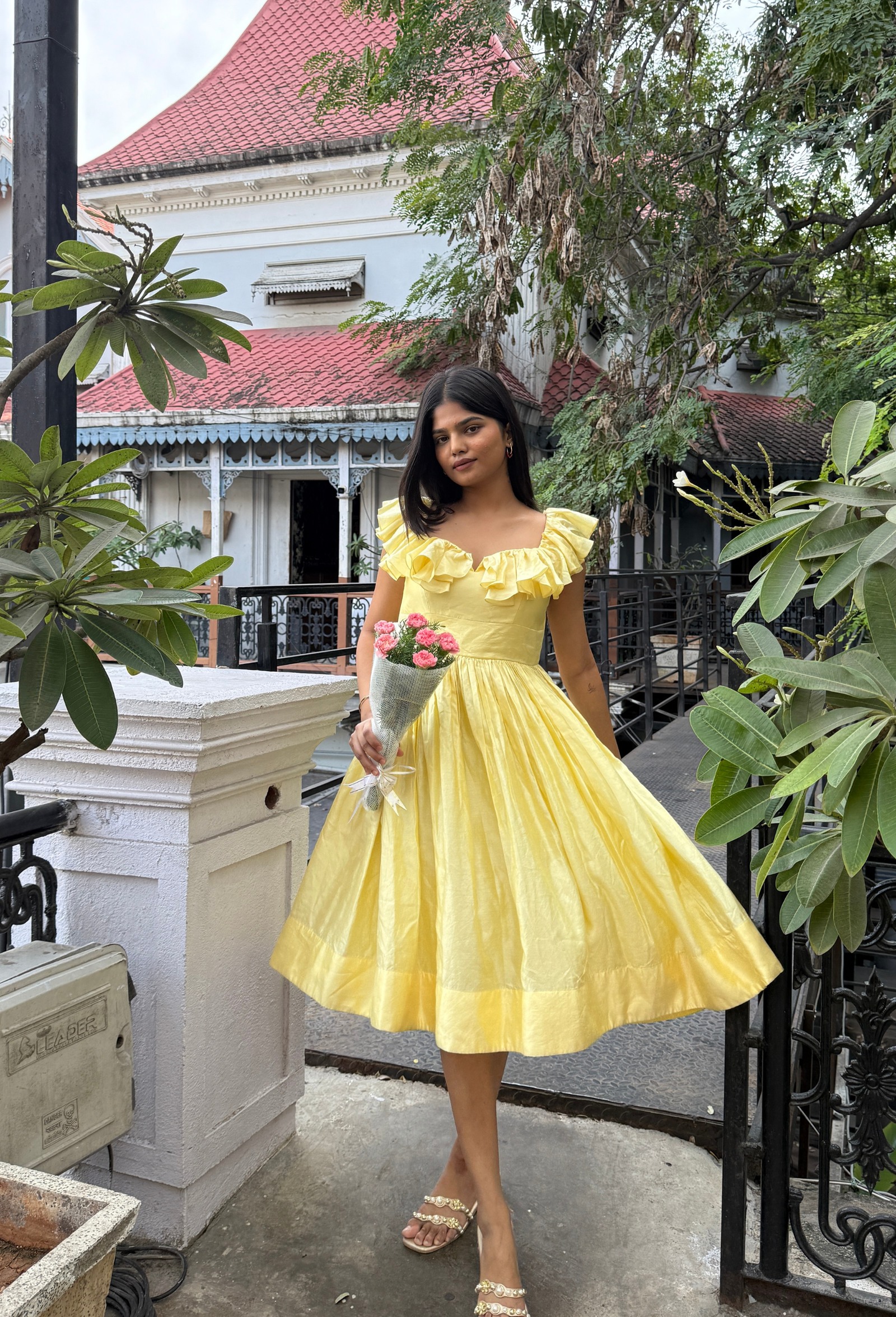 Bright, joyful, and irresistibly graceful — the Butter Bloom frock captures sunshine in spun Chanderi silk. The soft butter-yellow color paired with ruffled sleeves adds playful sophistication, while the flowing silhouette ensures comfort and charm. Ideal for cheerful lunches, birthday gatherings, or afternoon parties that call for something bright and beautiful.