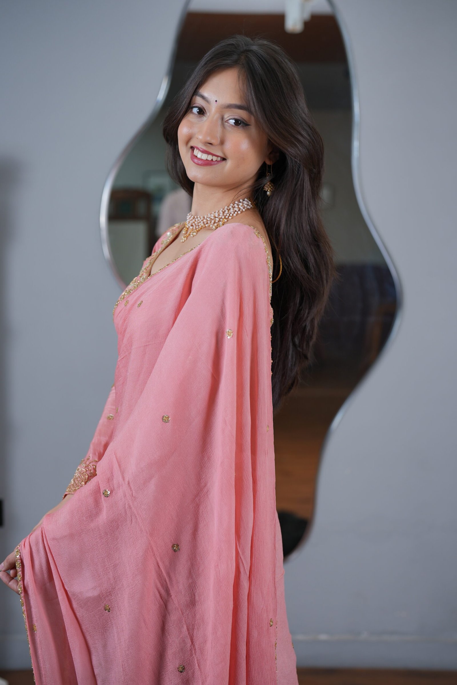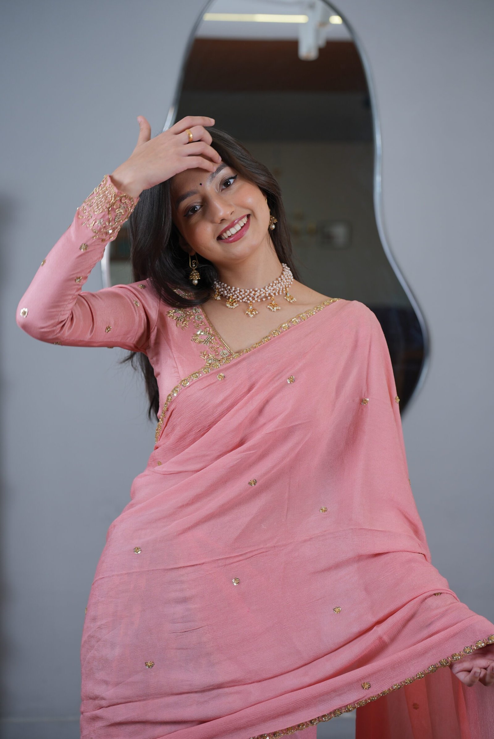 This elegant printed chanderi silk lehenga is paired with a hand-embroidered dupion silk blouse and a chiffon hand-embroidered dupatta, blending prints and textures beautifully. Perfect for festive gatherings and pre-wedding occasions.