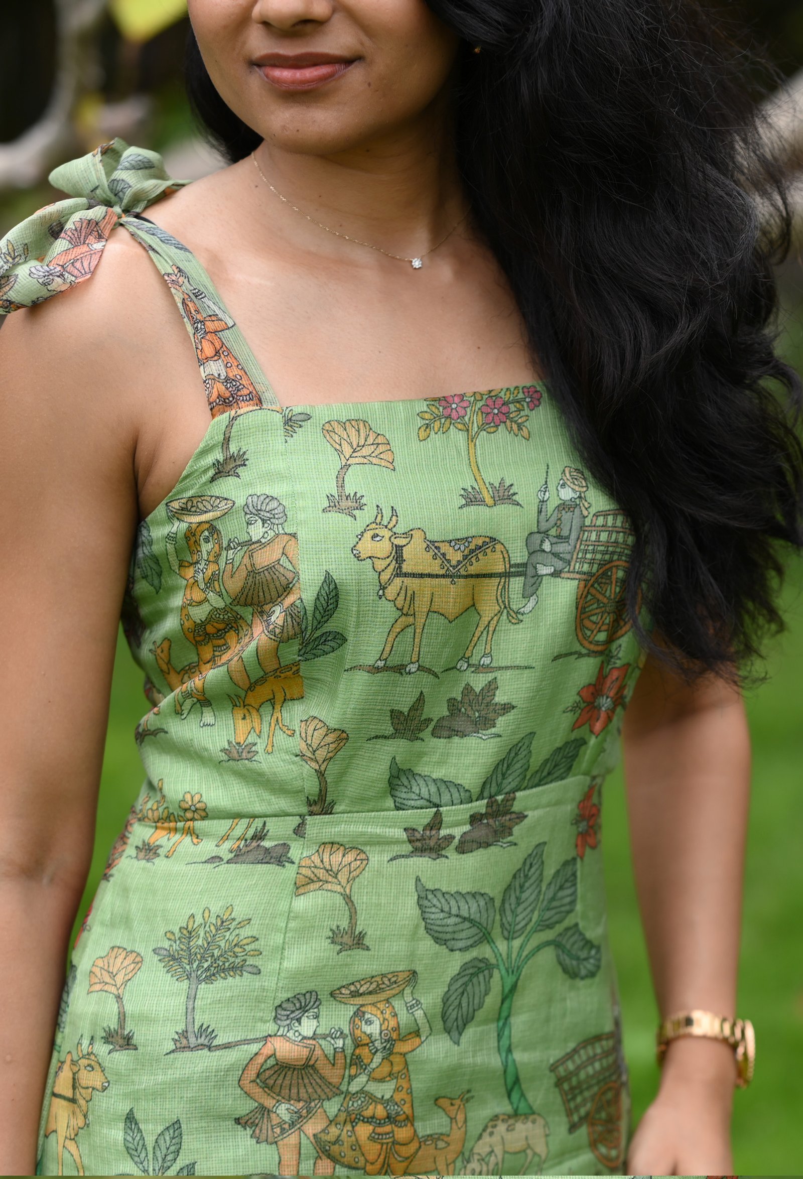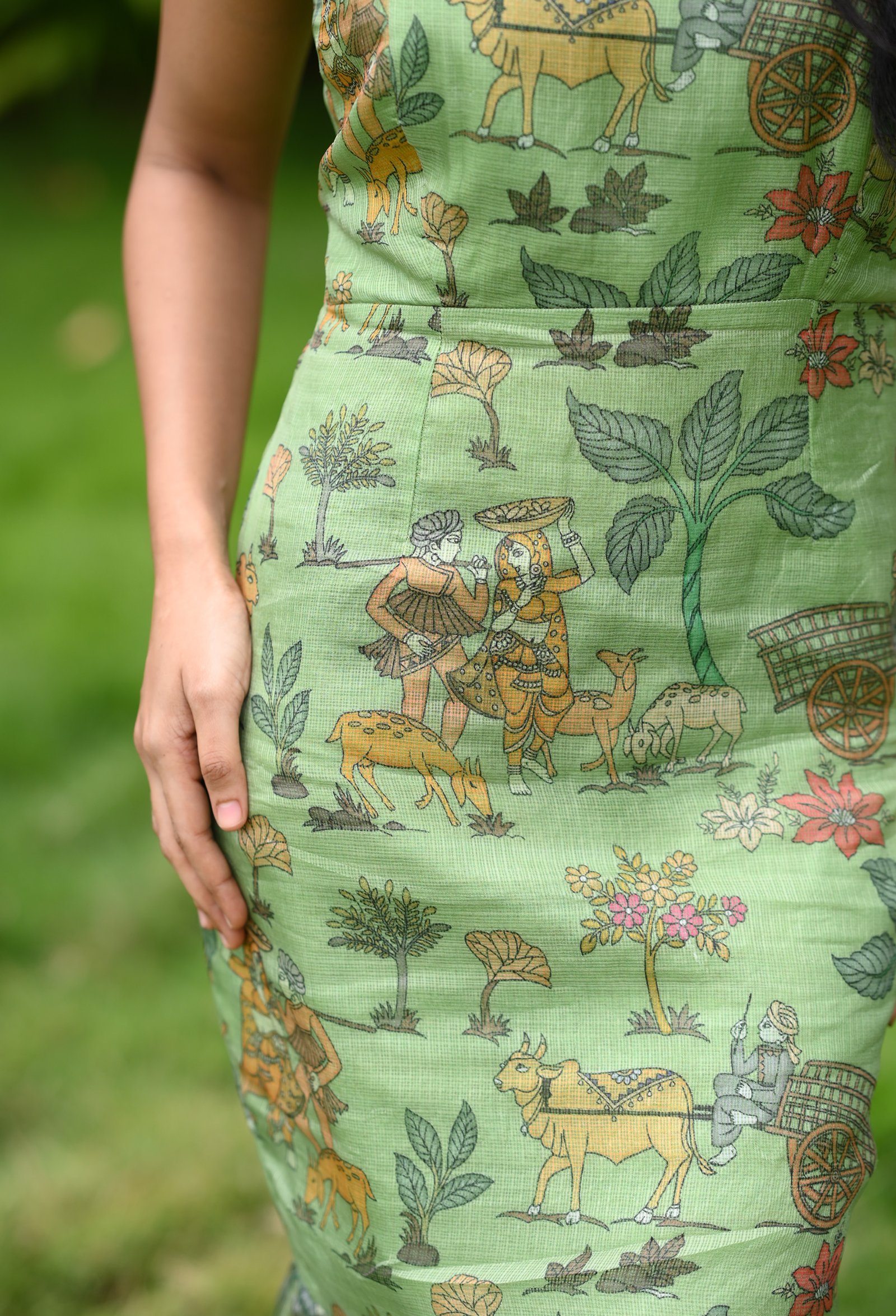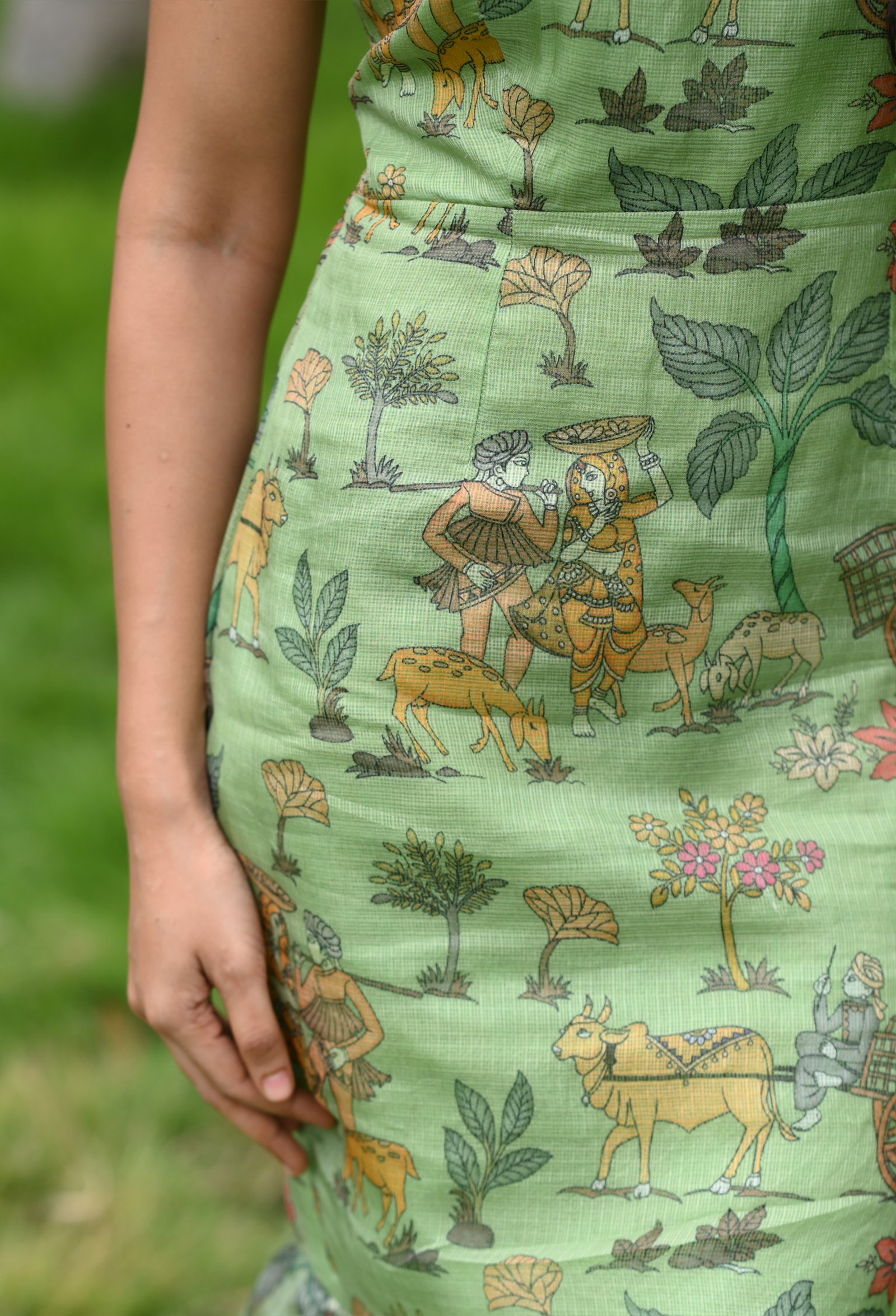 Telling tales of pastoral charm and melodic simplicity, The Mithila Dress is a poetic fusion of heritage and silhouette. Handcrafted in premium Kota Doria silk, the dress features a vivid scene of Indian village life—with folk characters, flora, bullock carts, and grazing animals—meticulously printed in earthy tones over a soft green canvas.