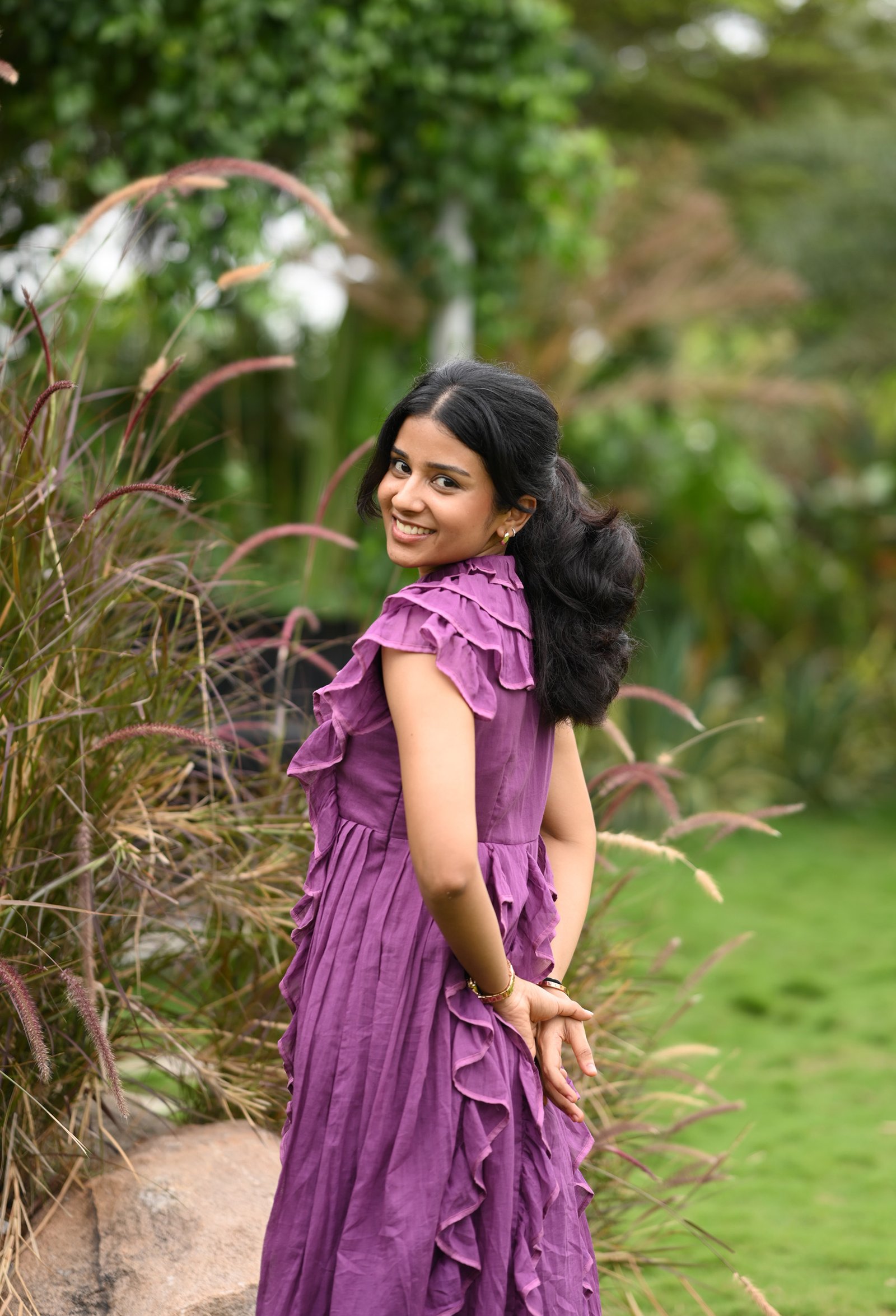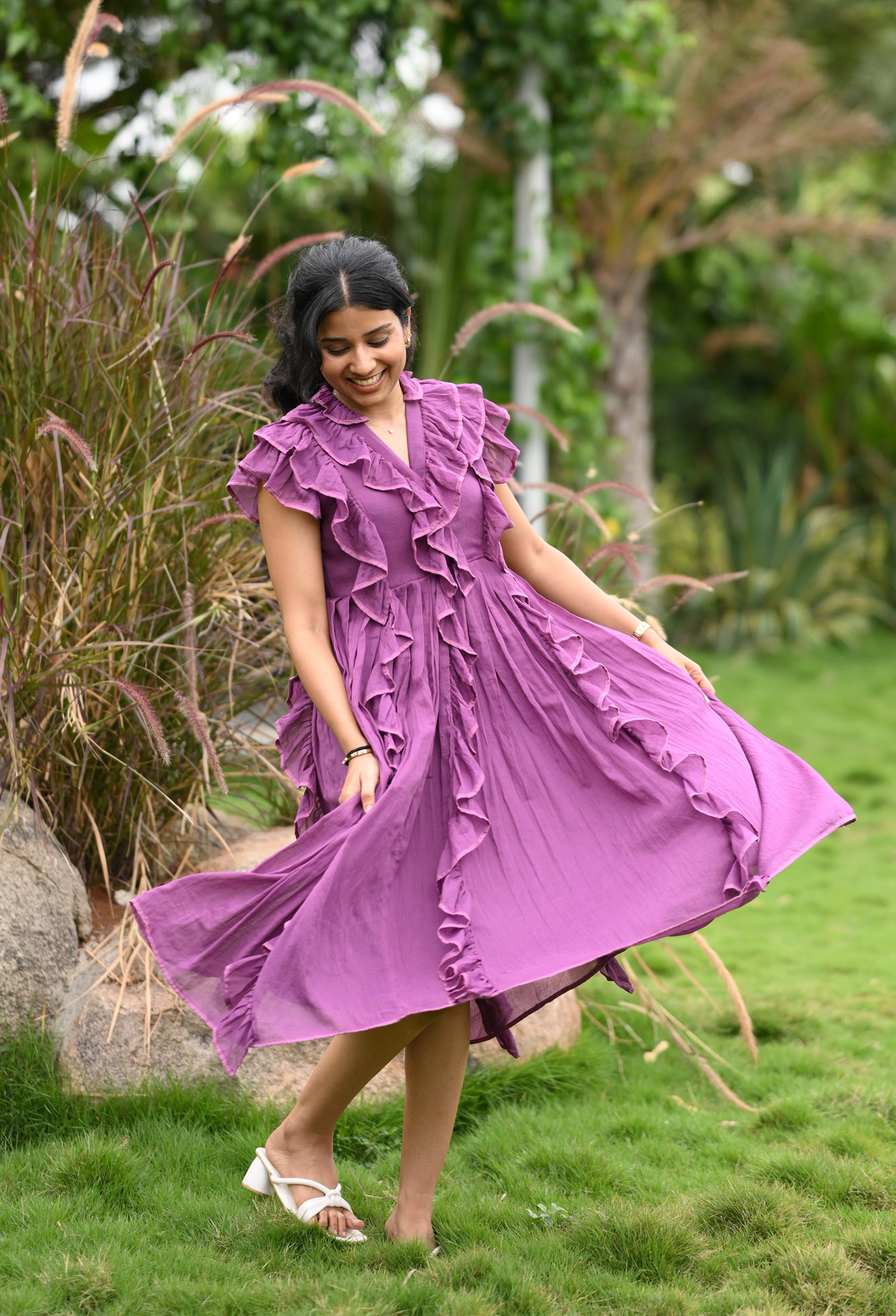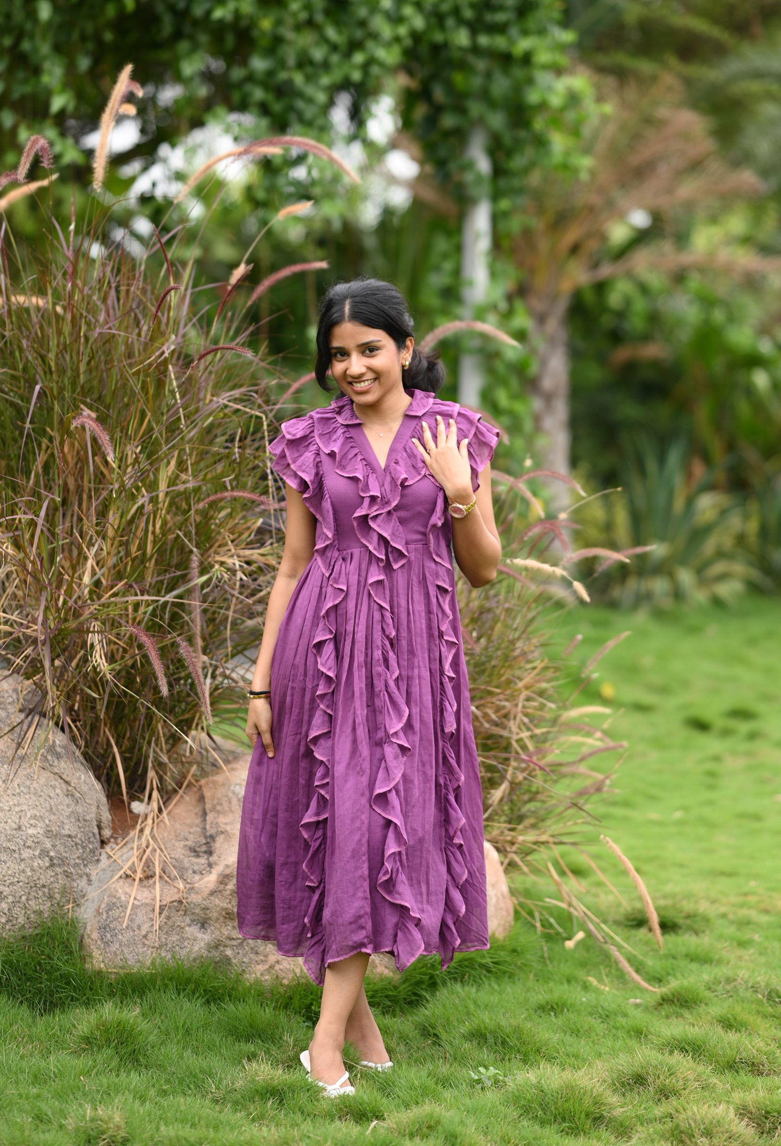Crafted in breathable mul cotton, this mulberry-hued dress is a celebration of softness and statement. The dress features cascading ruffles that trace the V-neckline and flow gracefully along the bodice and hem, adding a romantic flair to every movement. Designed with a gently flared silhouette and light pleating, it’s the kind of dress that makes you feel both playful and poised.