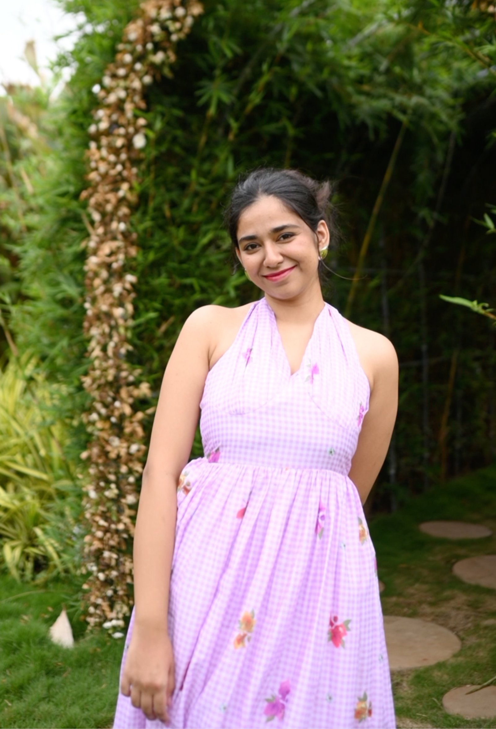 Crafted in 100% muslin silk, this gingham midi dress is a poetic blend of comfort and elegance. Its breezy fit gently gathers at the waist, while the custom bougainvillea print adds a touch of botanical romance. The signature bow-tie shoulder sash brings a playful edge, and the tiered hem sways like petals in the wind—graceful, effortless, free.