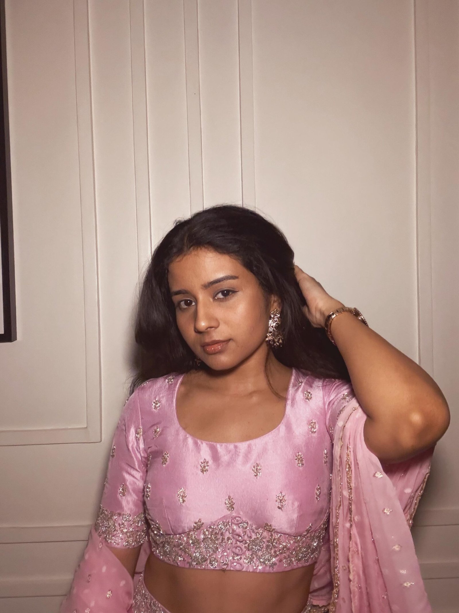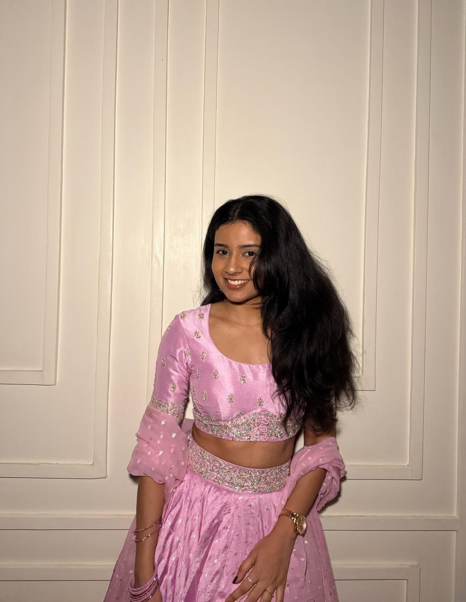 This elegant lilac dupion silk lehenga comes with a hand-embroidered blouse and a matching hand-embroidered waist band, adding structure and charm to the look. Perfect for daytime celebrations and intimate festive gatherings.