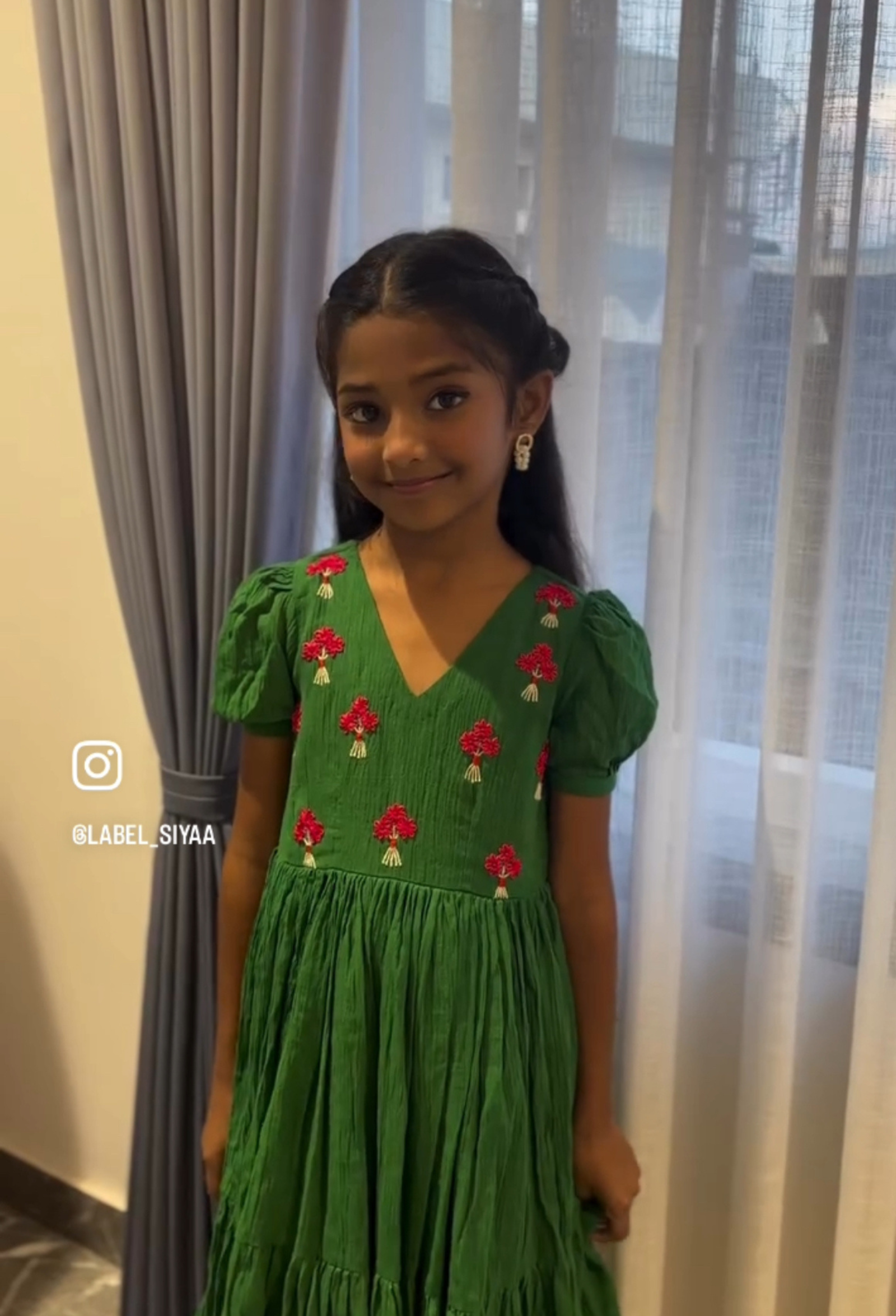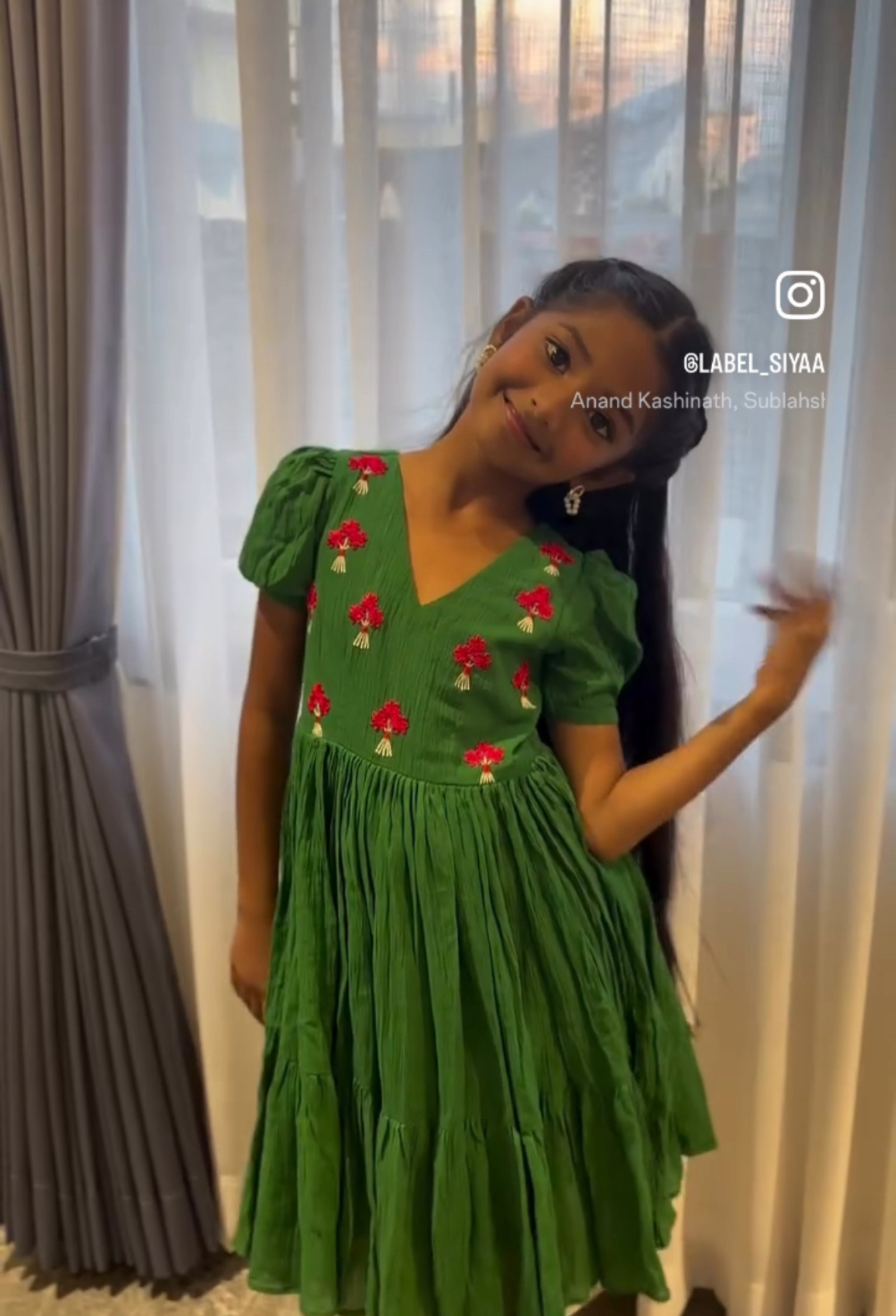 Made from soft crush cotton, this lovely green frock features delicate hand-embroidered floral motifs across the bodice, adding a cheerful pop of color. The V-neckline and puffed sleeves lend it a charming silhouette, perfect for festive gatherings, birthdays, or casual celebrations.