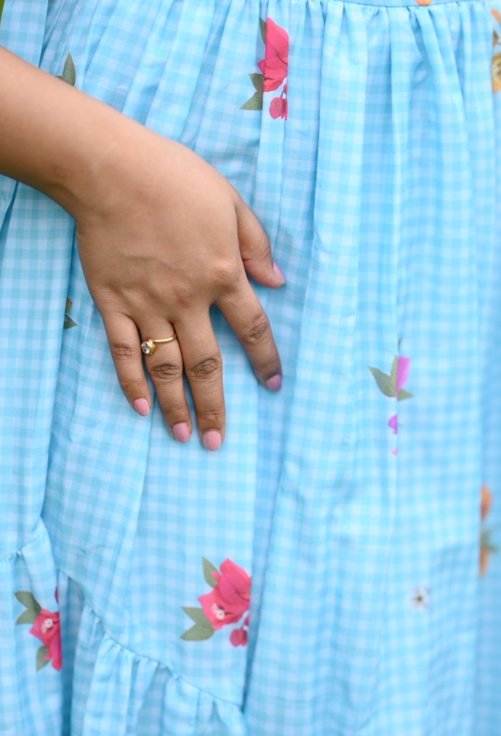 Light as a breeze and fresh as morning skies, this gingham midi dress in sky blue is a breath of calm wrapped in florals. Crafted in luxurious muslin silk, it flows with natural ease—delicately gathered at the waist and tied with soft shoulder sashes.