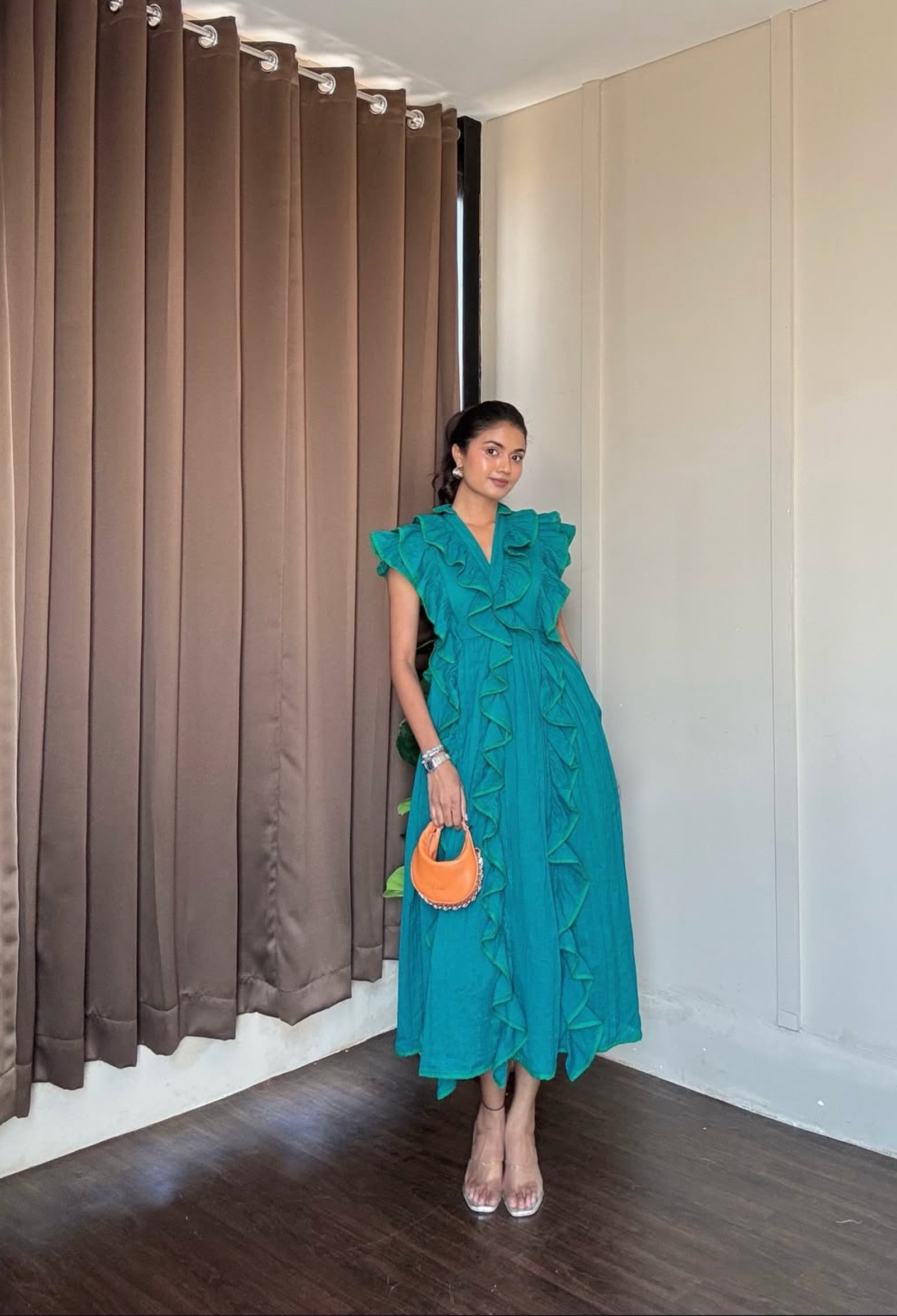 Crafted in breathable mul cotton, this TEAL blue dress is a celebration of softness and statement. The dress features cascading ruffles that trace the V-neckline and flow gracefully along the bodice and hem, adding a romantic flair to every movement. Designed with a gently flared silhouette and light pleating, it’s the kind of dress that makes you feel both playful and poised.